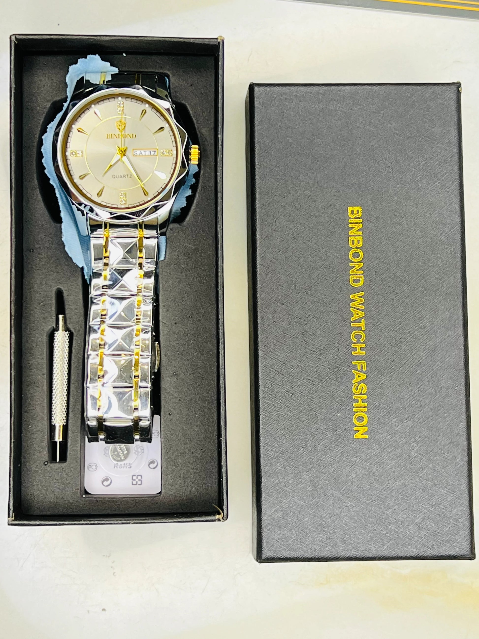 A bold fusion of elegance and modern design. Featuring a striking silver prism dial that catches the light from every angle, this Binbond timepiece pairs classic two-tone detailing with a contemporary edge. Built for both style and durability, it’s perfect for daily wear or special occasions.